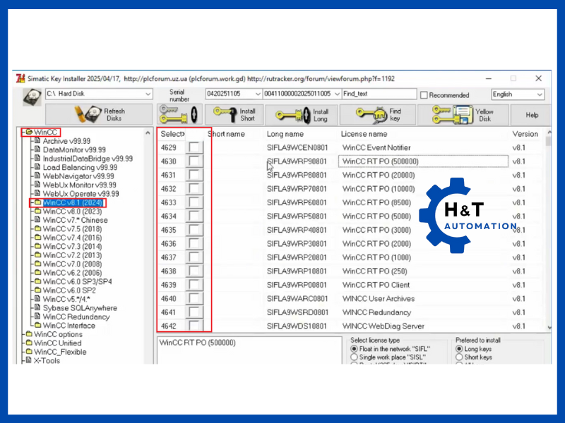 Bước 8: Tại nhánh bên trái, các bạn tìm tới mục WinCC, chọn Wincc v8.1 (2024), sau đó chọn các license để cài đặt, lưu ý các bạn nên chọn những license có giá trị cao nhất, không nên chọn hết, vì khi chọn hết hãng sẽ tính cho bạn license nào thấp nhất. Nhớ trỏ vào đúng ổ đĩa mà các bạn lưu đường dẫn file cài. Nếu các bạn cài vào ổ C thì chọn đường dẫn là ổ C.