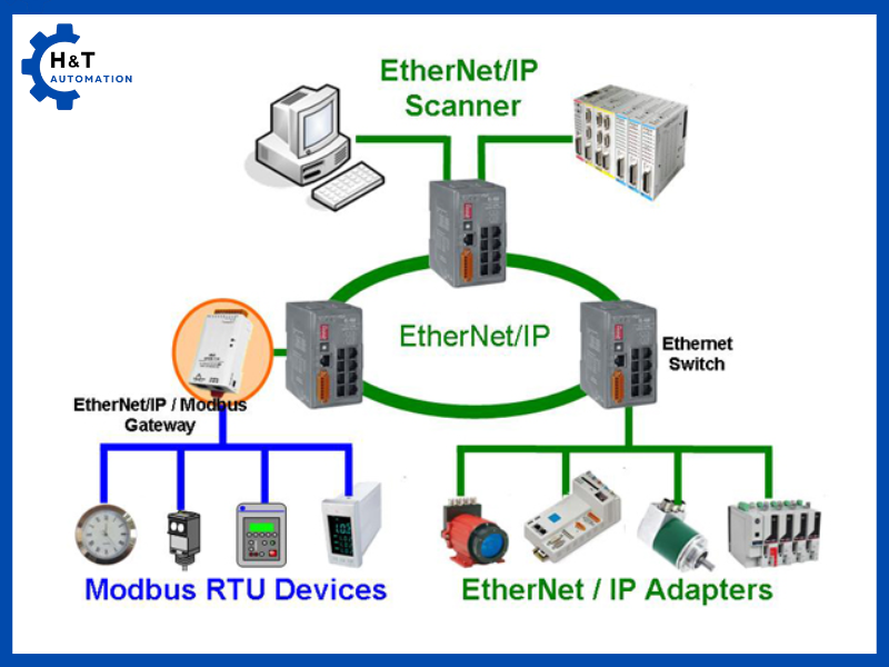 EtherNet/IP (Ethernet Industrial Protocol) là giao thức truyền thông công nghiệp dựa trên nền tảng Ethernet tiêu chuẩn, được phát triển bởi tổ chức ODVA. EtherNet/IP cho phép truyền cả dữ liệu điều khiển thời gian thực lẫn dữ liệu thông tin giữa các thiết bị trong hệ thống tự động hóa như PLC, robot, biến tần, HMI… Điểm mạnh của EtherNet/IP là khả năng tích hợp dễ dàng vào mạng IT, tốc độ truyền cao và khả năng mở rộng lớn. Giao thức này sử dụng chuẩn CIP (Common Industrial Protocol), giúp các thiết bị từ nhiều nhà sản xuất khác nhau có thể giao tiếp và tương thích tốt, đáp ứng nhu cầu của các nhà máy thông minh và công nghiệp 4.0.