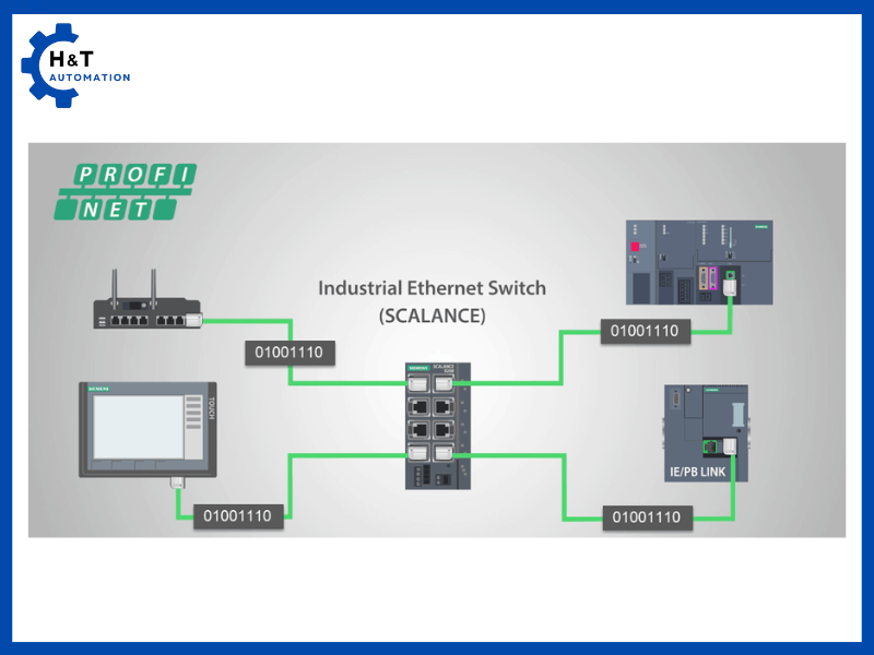 PROFINET là giao thức truyền thông công nghiệp thuộc họ Ethernet công nghiệp, do Siemens và các đối tác phát triển, dùng để kết nối và trao đổi dữ liệu giữa các thiết bị tự động hóa như PLC, HMI, cảm biến, biến tần… trong hệ thống sản xuất. Ưu điểm nổi bật của PROFINET là tốc độ truyền dữ liệu nhanh, độ tin cậy cao và khả năng đồng bộ thời gian chính xác, phù hợp cho các ứng dụng đòi hỏi phản hồi tức thì. Ngoài ra, PROFINET hỗ trợ cấu trúc mạng linh hoạt, dễ mở rộng, đồng thời tích hợp các chức năng chuẩn đoán và bảo trì giúp giảm thời gian dừng máy và tối ưu hóa vận hành