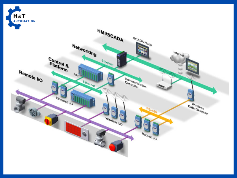 Trong bối cảnh tự động hóa sản xuất ngày càng phát triển mạnh mẽ, mạng truyền thông công nghiệp trở thành một phần không thể thiếu, giúp kết nối, trao đổi và xử lý dữ liệu giữa các thiết bị trong nhà máy, xí nghiệp. Không chỉ đảm bảo tính giao tiếp đồng bộ, các mạng này còn đóng vai trò quan trọng trong việc kiểm soát quy trình, nâng cao hiệu quả vận hành cũng như đảm bảo an toàn và bảo mật hệ thống. Bài viết dưới đây của H&T Automation sẽ giúp bạn hiểu rõ khái niệm, cấu trúc và các loại mạng truyền thông công nghiệp, từ các giao thức phổ biến như Modbus, Profibus, Ethernet IP, Profinet đến các công nghệ tiên tiến như FlexCloud, đồng thời so sánh chúng với mạng máy tính và mạng viễn thông để thấy được những đặc thù và vai trò riêng biệt của từng loại mạng.