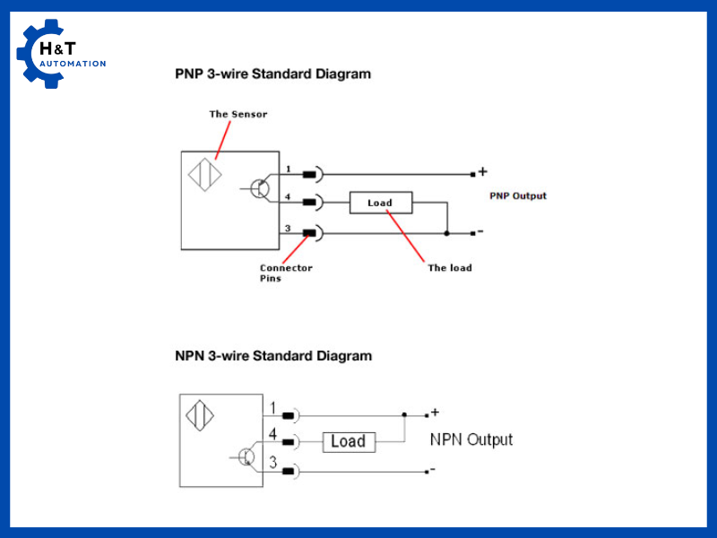 - PNP (sourcing): Phù hợp với các hệ thống yêu cầu ổn định cao, ít bị nhiễu, dễ bảo trì. Khi kích hoạt, PNP cấp điện áp dương (+Vdc) cho tải.