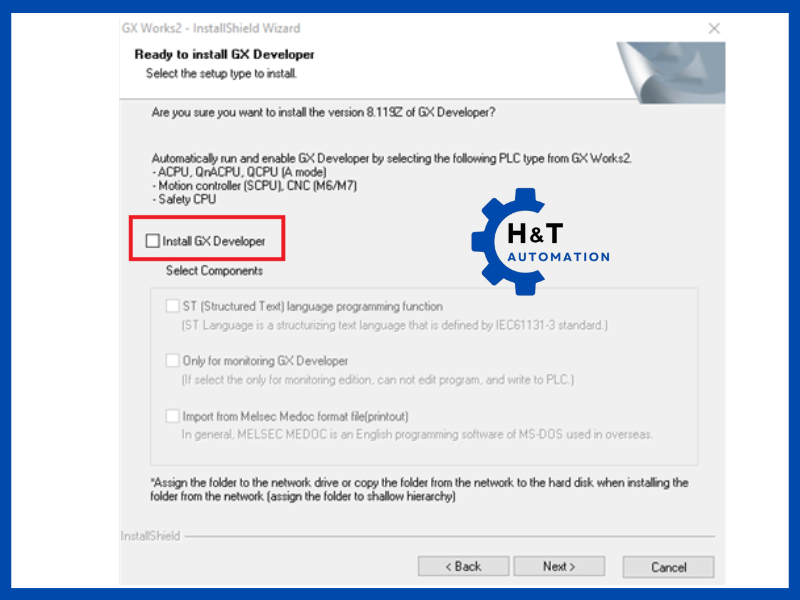 Sau khi bấm Next, phần mềm sẽ hỏi có lựa chọn cài thêm phần mềm GX Developer không, phần mềm này chỉ khác ở một số dòng PLC đời cổ, nên nếu không cần thiết thì ta nên bỏ tích ở ô Install GX Developer để hạn chế lỗi khi cài đặt